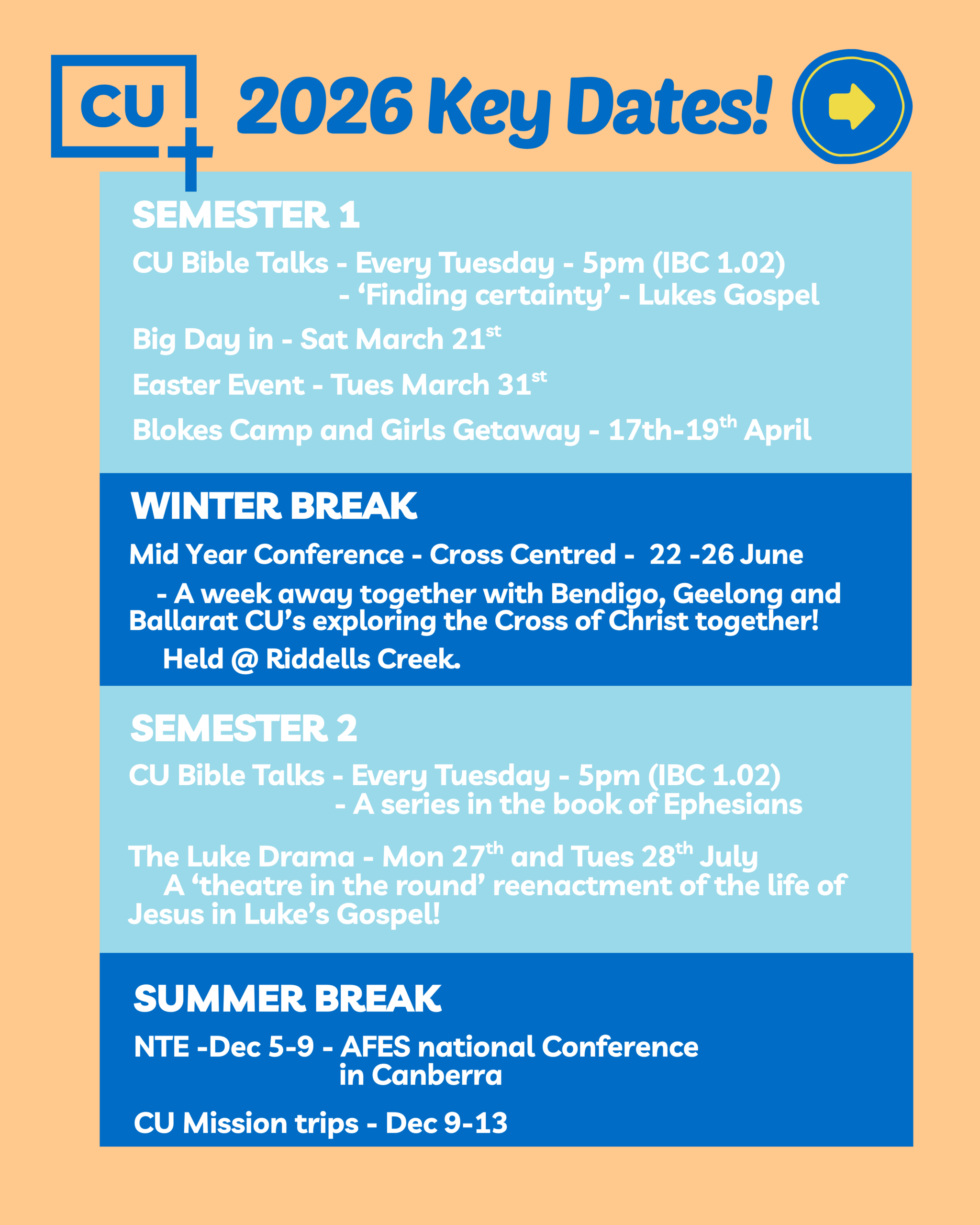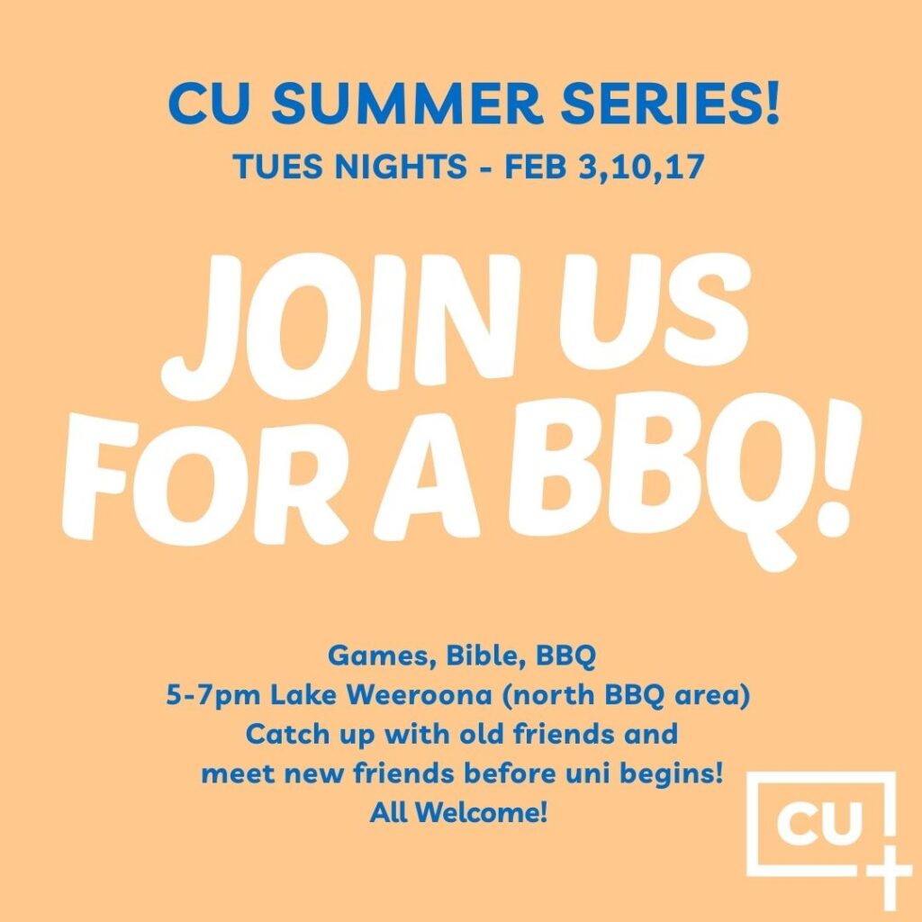 It’ll be heaps of fun to reconnect after the Summer break. It’ll be great to read God’s word together. Make sure to invite your friends and any Christians you know who are starting Uni this year.